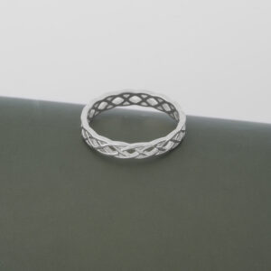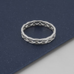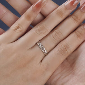 Chiếc nhẫn nổi bật với họa tiết nút thắt Celtic uốn lượn mềm mại quanh toàn bộ vòng nhẫn – biểu tượng của sự kết nối bất tận, tình yêu không điểm bắt đầu cũng chẳng có hồi kết. Mỗi đường nét đan xen tinh xảo như một lời cam kết cho sự bền lâu, vững chắc trong các mối quan hệ.