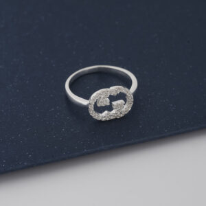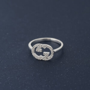Chiếc nhẫn này nằm trong bộ sưu tập trang sức Interlocking lấy cảm hứng từ logo hình học. Điểm nhấn của thiết kế là biểu tượng chữ “G” đan xen cách điệu, được đính kín bởi những viên đá cubic zirconia nhỏ lấp lánh theo kiểu pavé, tạo nên một vòng tròn ánh sáng rực rỡ, vừa thanh lịch vừa nổi bật.