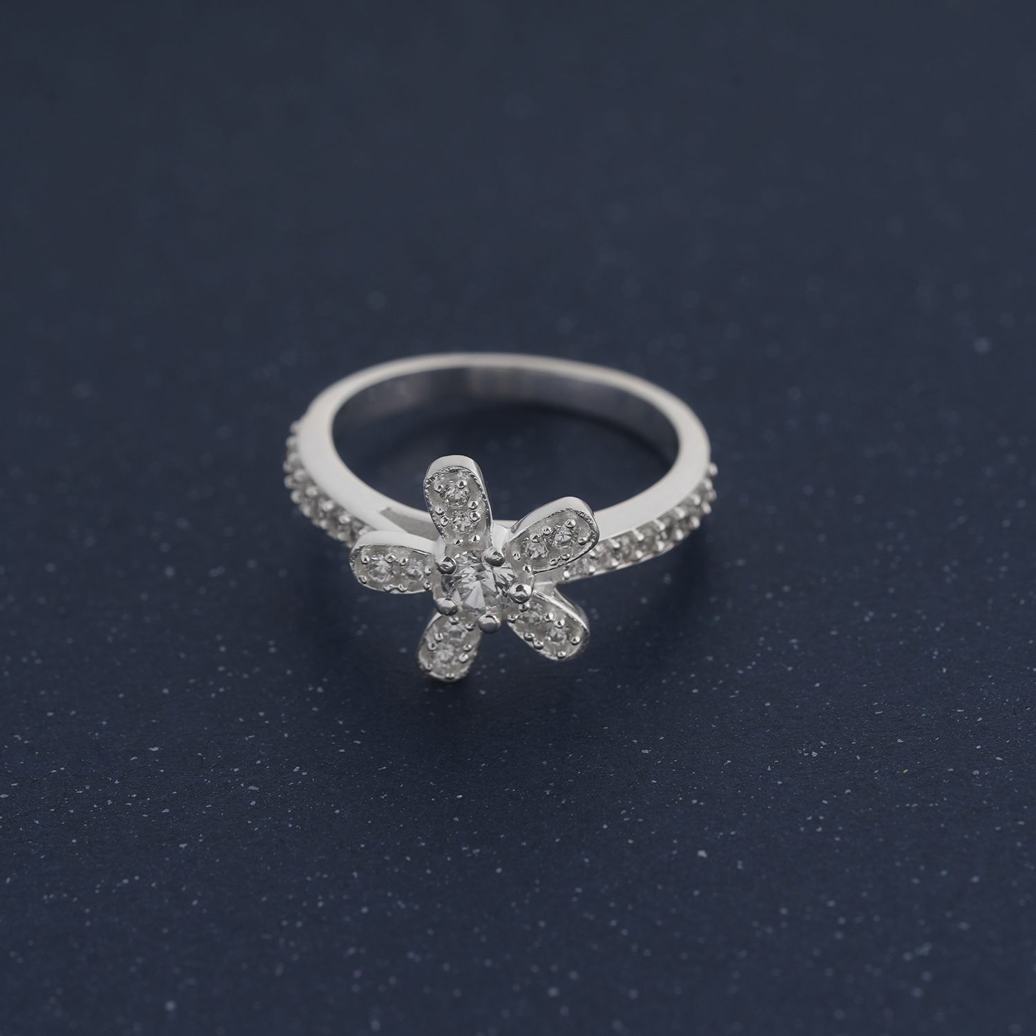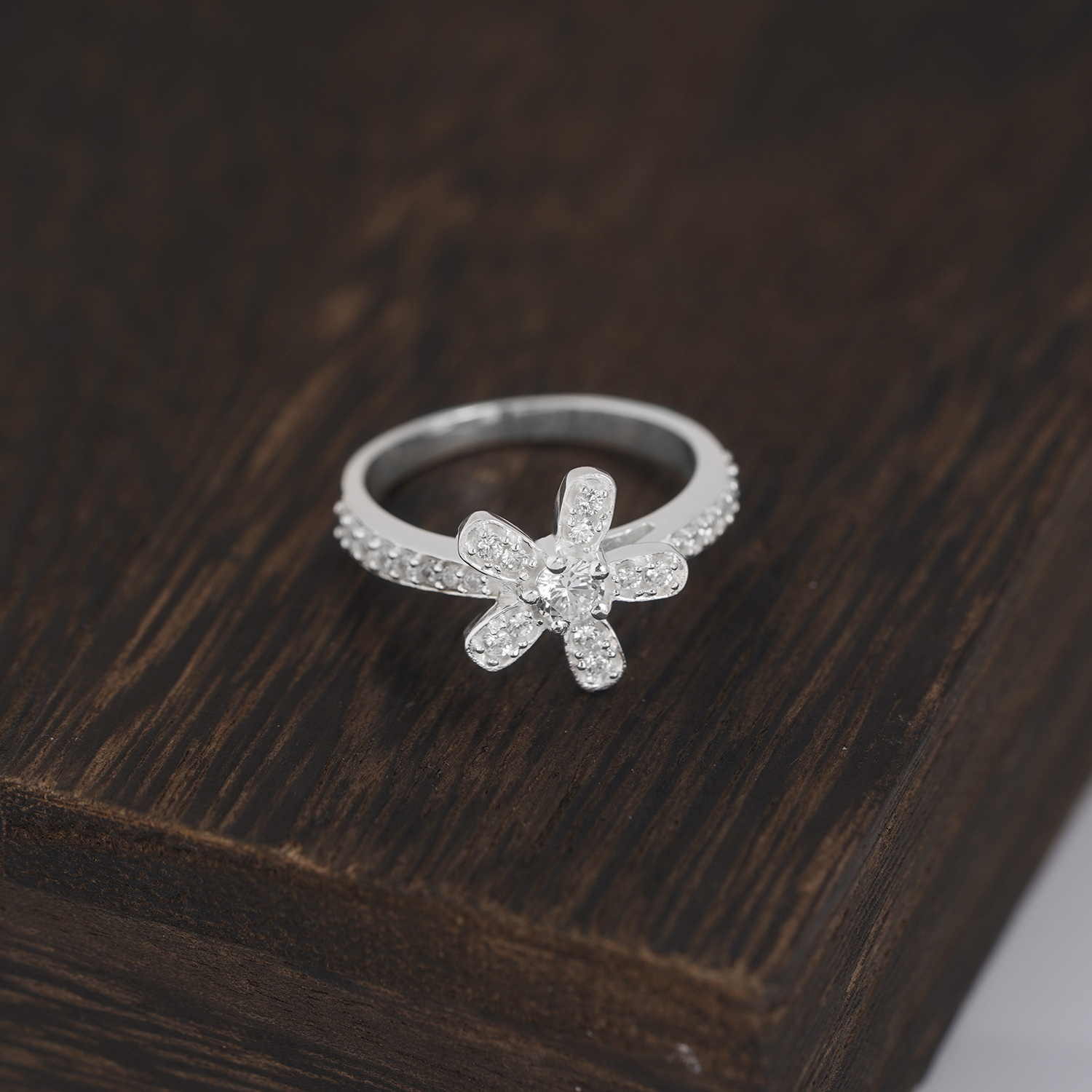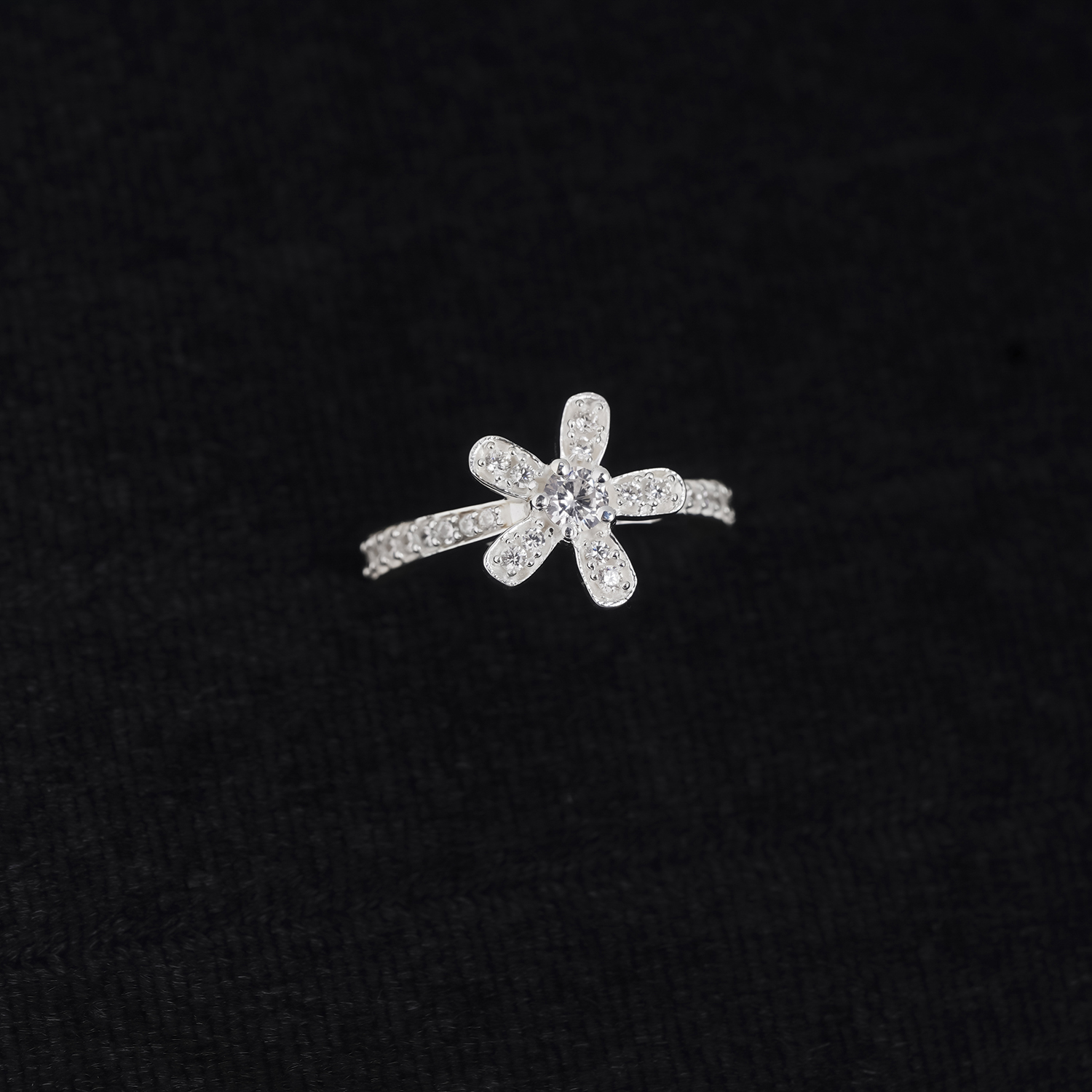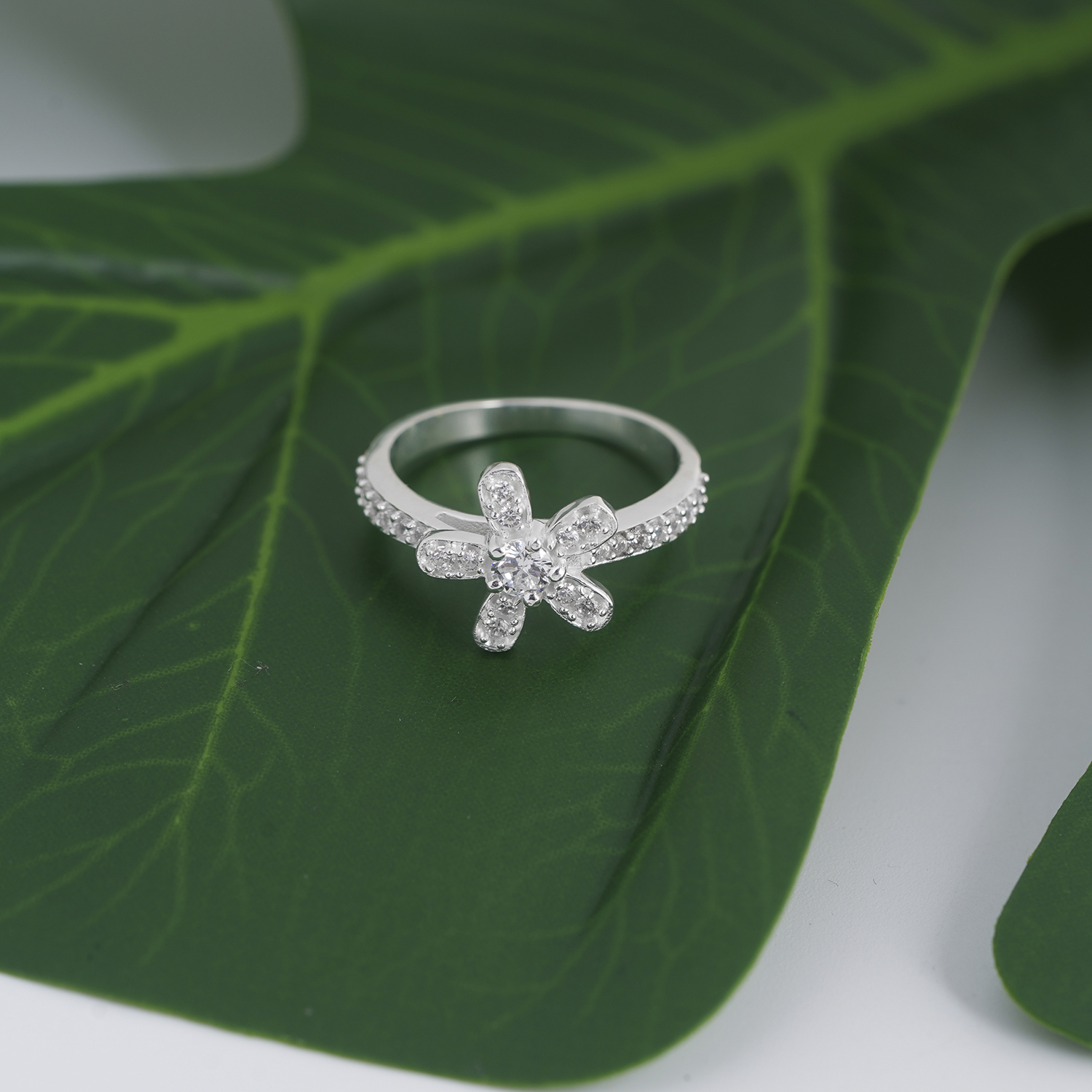 Mặt chính của nhẫn được thiết kế hình bông hoa đính full đá nên tạo hiệu ứng ánh sáng lung linh, tựa như bông hoa nở rộ dưới ánh nắng. Khi đeo chiếc nhẫn này lên tạo cảm giác rất tươi mát và nhẹ nhàng. Thân nhẫn mảnh mai, được trang trí thêm dải đá chạy dọc, ôm khít ngón tay với sự thoải mái và nhẹ nhàng, phù hợp để đeo hàng ngày hoặc làm điểm nhấn cho những dịp đặc biệt.